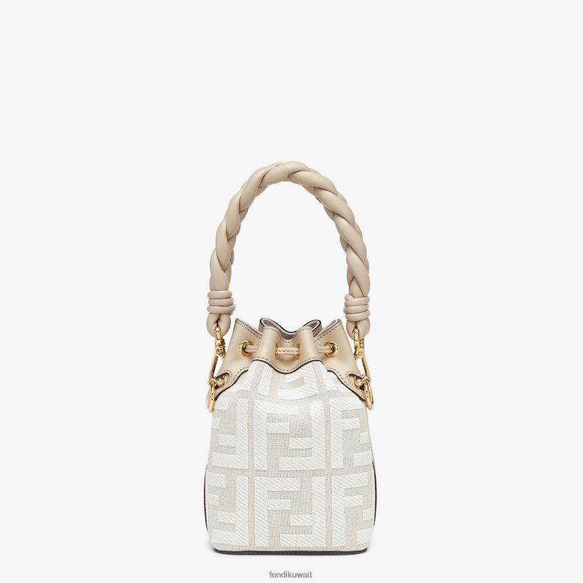 حقيبة دلو مون تريزور صغيرة مصنوعة من القماش الأبيض مع تطريز بارز على شكل حرف FF، ومزخرفة بجلد باللون الرمادي الفاتح.