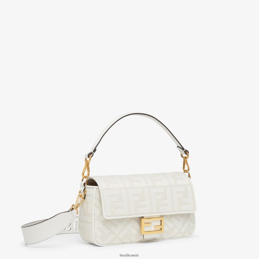 حقيبة باغيت متوسطة الحجم أيقونية مصنوعة من القماش الأبيض مع شعار ff بارز ومزخرفة بتطريز ملون ومزخرفة بالجلد ومزينة بمشبك ff.
