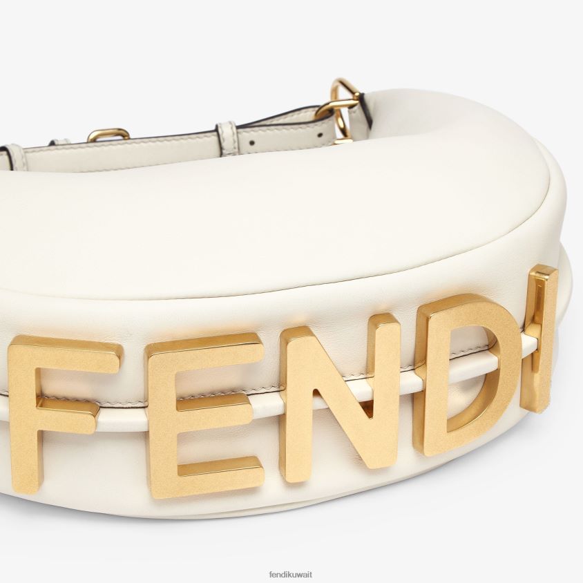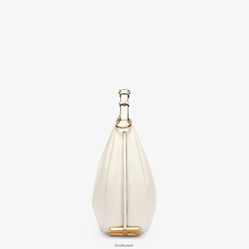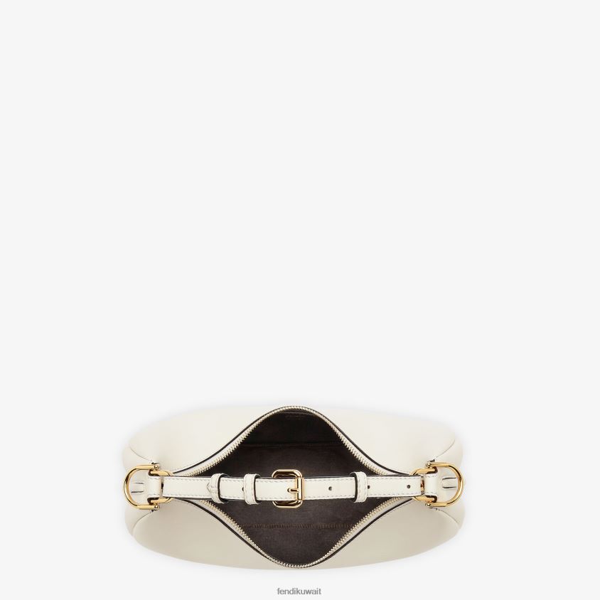 حقيبة هوبو صغيرة مصنوعة من الجلد الأبيض الناعم، مع حروف فندي معدنية ذهبية عتيقة يمكن رؤيتها عند ارتداء الحقيبة تحت الذراع.
