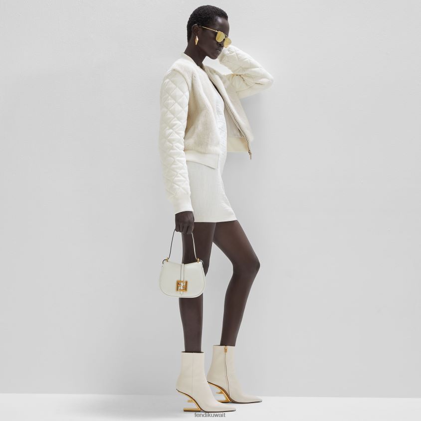 حقيبة صغيرة بخطوط أنثوية منحنية مصنوعة من الجلد الأبيض. مزينة بتفاصيل وحواف منقوشة وشعار ff على الغطاء.