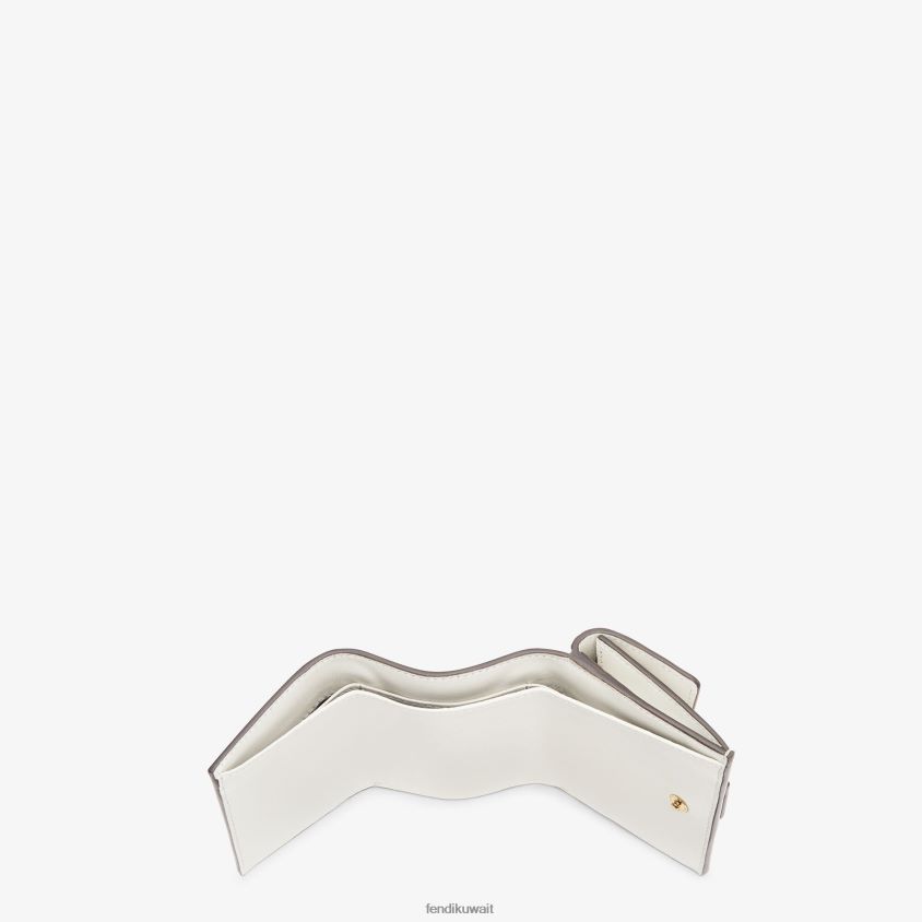 محفظة صغيرة الحجم من الرغيف الفرنسي ثلاثية الطي مع حجرة داخلية كبيرة للفواتير وثلاثة حاملات بطاقات مخفية ومحفظة خارجية للعملات المعدنية مع إغلاق سريع. مصنوع من جلد نابا باللون الأبيض مع تصميم ff ثلاثي الأبعاد. أدوات معدنية مطلية بالذهب.
