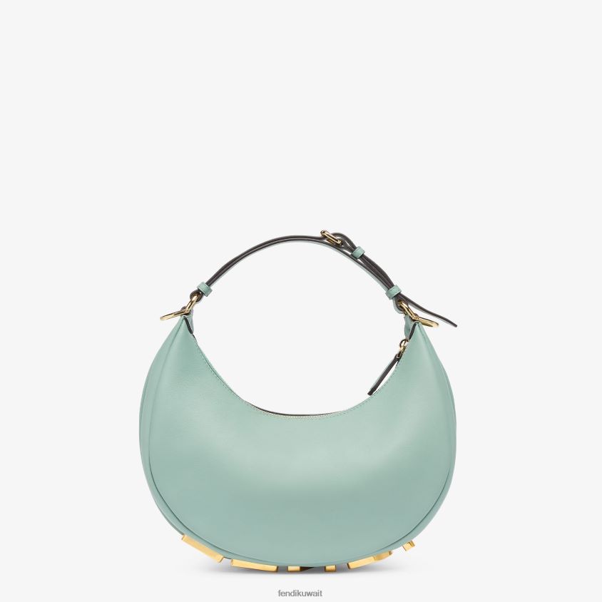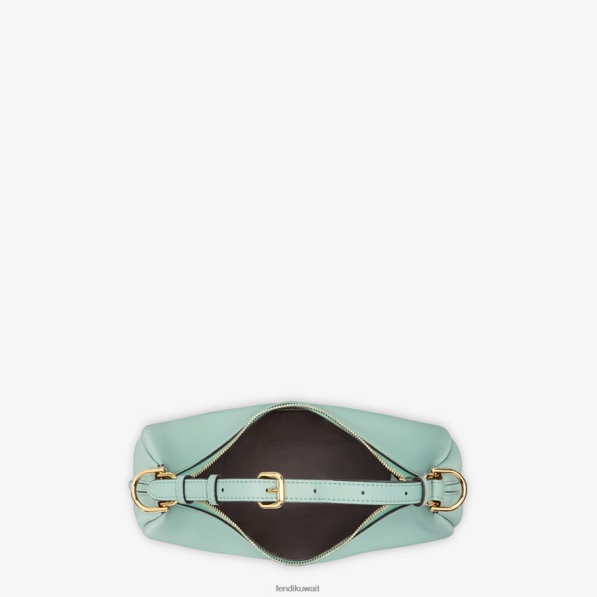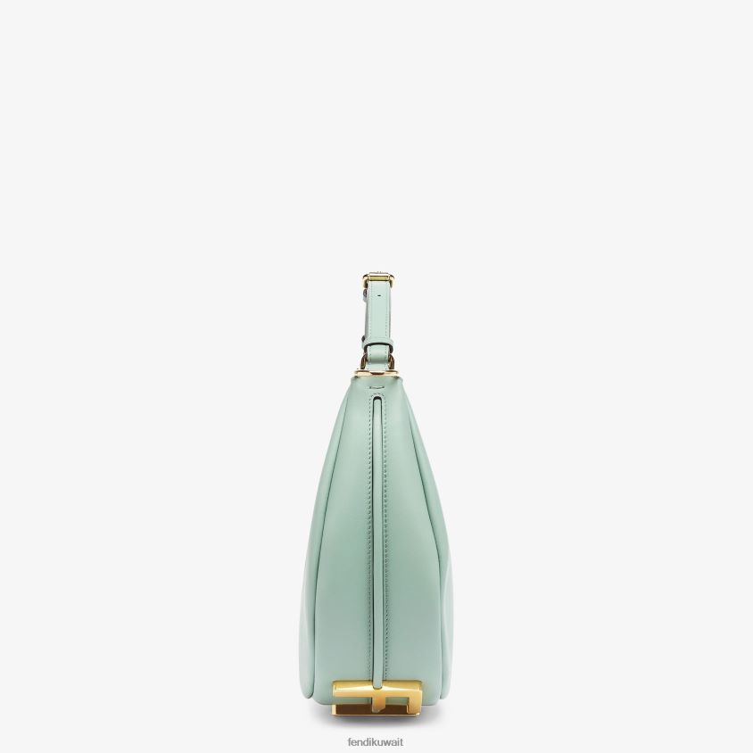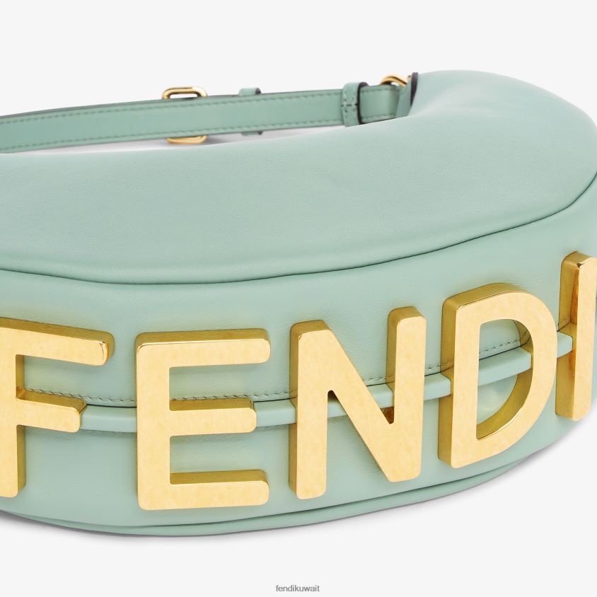 حقيبة هوبو صغيرة مصنوعة من الجلد الناعم باللون الأخضر النعناعي، ومزينة بحروف فندي معدنية ذهبية عتيقة يمكن رؤيتها عند ارتداء الحقيبة تحت الذراع.