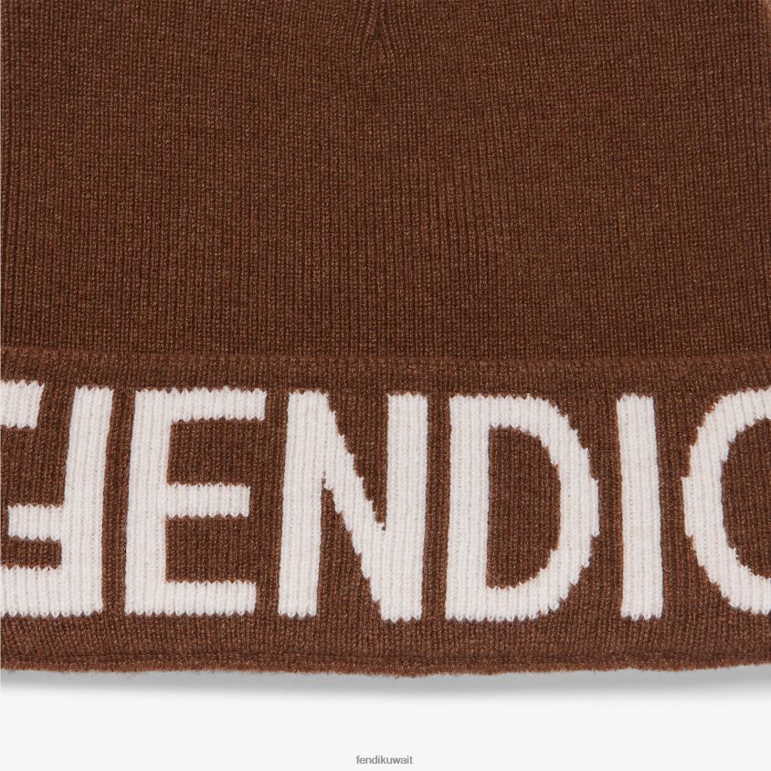 قبعة صغيرة مع حافة مطوية. مصنوعة من نسيج الصوف البني. الحافة مزينة بشعار مرآة فندي إنتارسيا بلون بيج متباين.