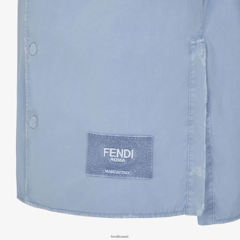 قميص بأكمام قصيرة وجيب رقعة على الصدر. فتحات جانبية في الحاشية وسهام في الخلف. إبزيم بالضغط مغطى. مصنوع من القطن المصبوغ باللون الأزرق الفاتح. مزخرف بعلامة فندي روما المطرزة ذات الألوان المتطابقة وتفاصيل مدمرة بسبب تأثير التآكل.