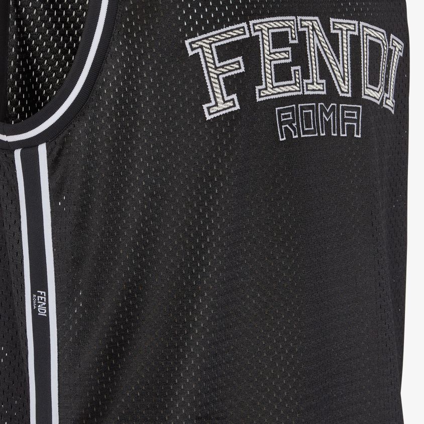 سترة شبكية سوداء على طراز كرة السلة. تم تخصيصه بتطريز حروف فندي روما المتباينة على الجهة الأمامية. حواف متماسكة مخططة باللونين الأسود والأبيض.