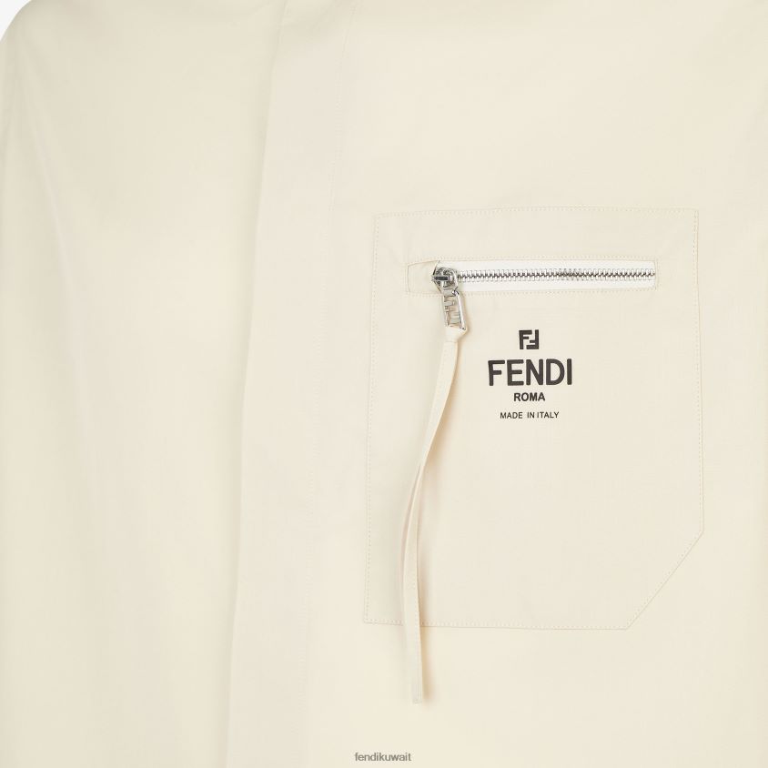 قميص بأكمام قصيرة وكبير الحجم. جيب بسحاب على الصدر. إغلاق بزر مغطى. مصنوع من القطن البيج. تم تشطيب جيب الصدر بشعار فندي روما المتباين ومنزلق فندي أولوك.