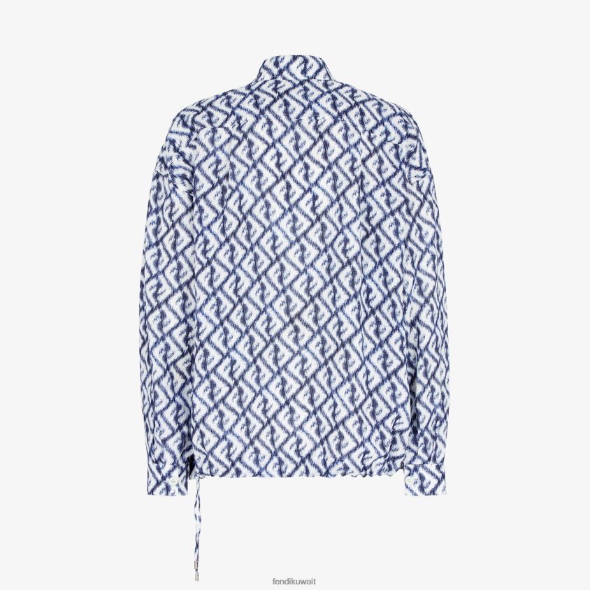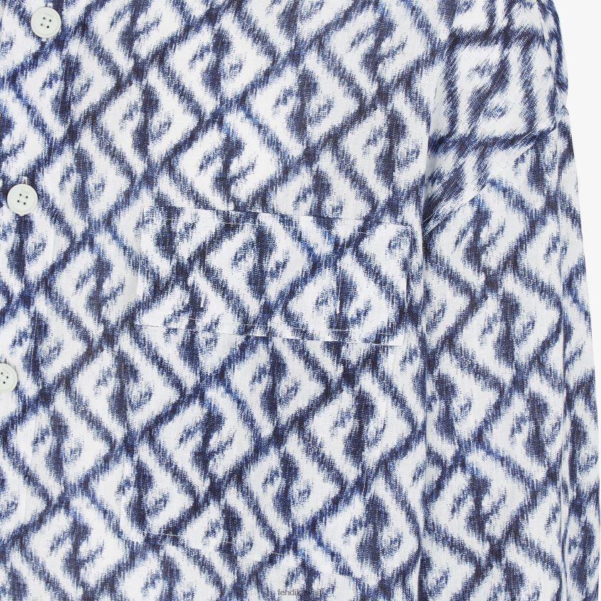 قميص كبير الحجم بحاشية برباط وجيوب رقعة بغطاء قلاب في الأمام. أكمام منخفضة القطع. إغلاق الزر. مصنوع من الكتان مع نقش ff مائل بتأثير ikat ومطبوع بالكامل باللونين الأزرق والأبيض.