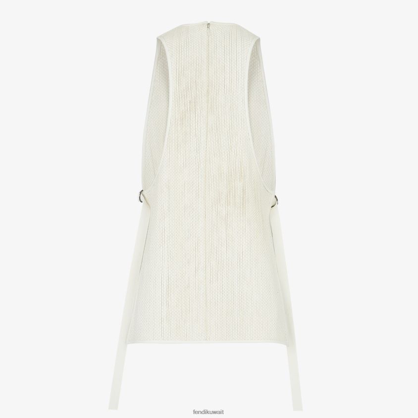 بلوزة مستقيمة بدون أكمام برقبة دائرية. أشرطة طويلة وحلقات معدنية على جانبي الخصر لتنظيم الملاءمة. إغلاق بسحاب خلفي غير مرئي. مصنوع من جلد أبيض متشابك تم صنعه على أنوال حرفية.