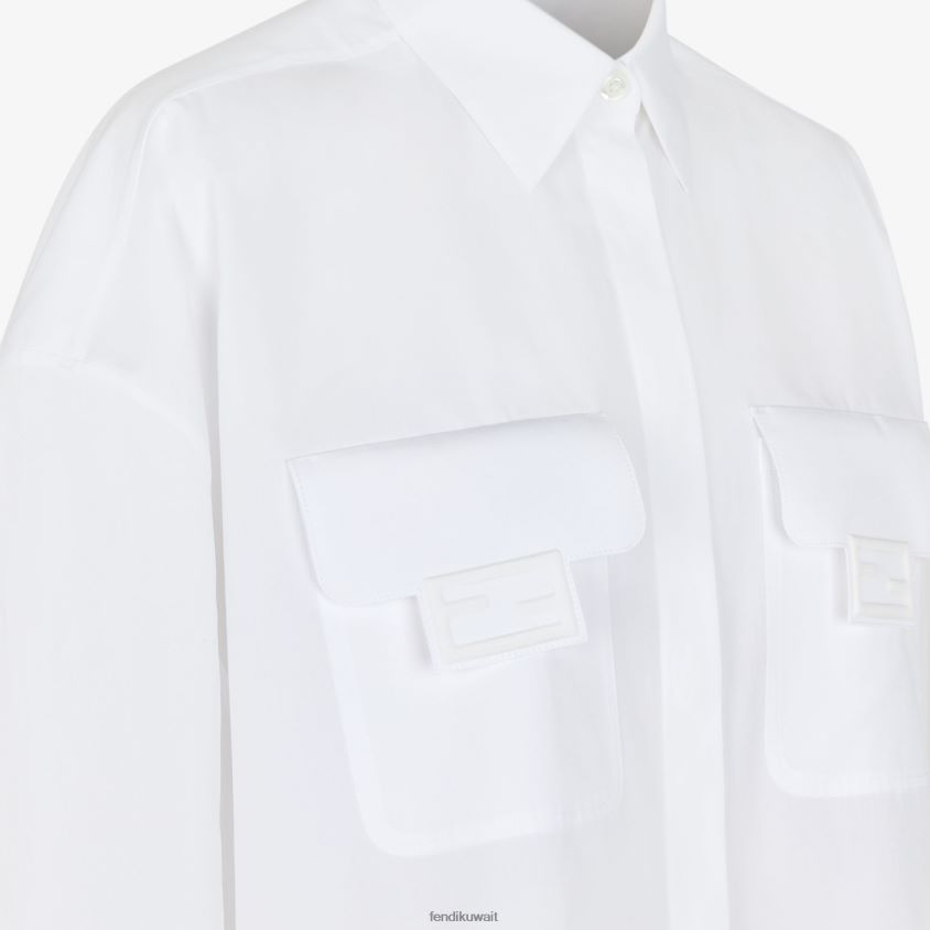 قميص قصير بقصة مربعة. يمكن ارتداء الأكمام الطويلة ذات الأزرار الجانبية ملفوفة وتثبيتها برباطات. مصنوعة من قطن البوبلين الأبيض. مزين بجيوب رقعة في الأمام بأشكال وأحجام مختلفة وتفاصيل باغيت منقوشة على شكل حرف ff.