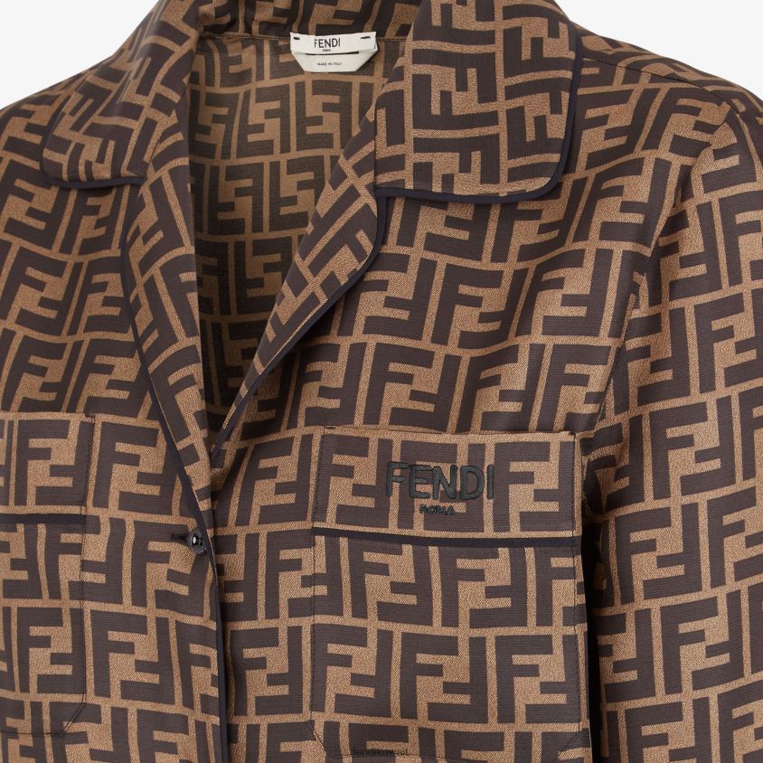 قميص متدفق بأكمام طويلة. مصنوع من نسيج قطني طويل من الحرير البني مع طباعة شعار ff على كامل التصميم. جيب على الصدر مطرز بحروف فندي باللون الأسود.