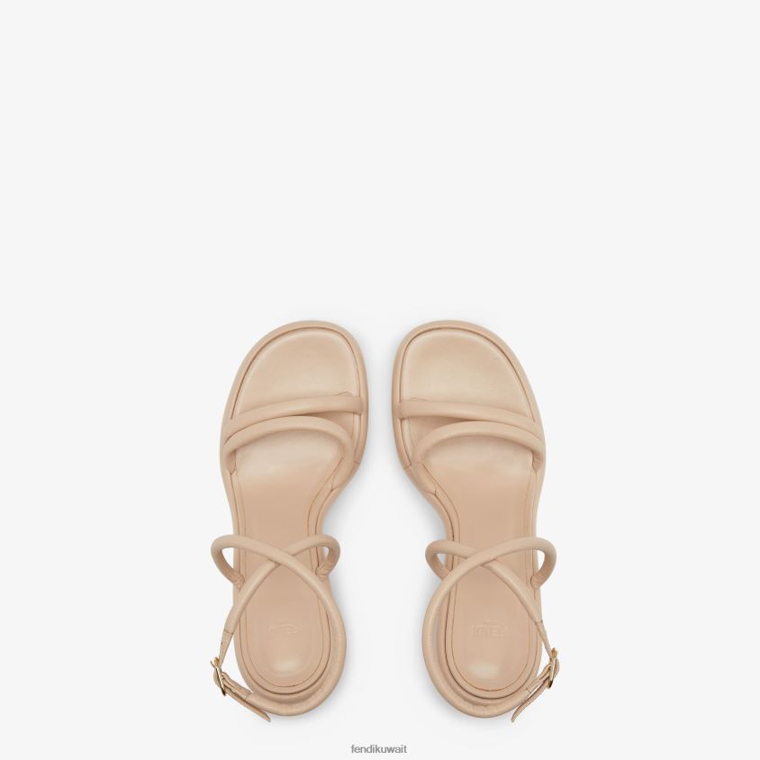 صندل باغيت مع أشرطة مبطنة قليلاً وحزام متقاطع على الكاحل والقوس. مصنوع من جلد نابا باللون البيج. كعب مع تصميم باغيت ff من المعدن الذهبي.