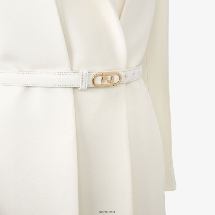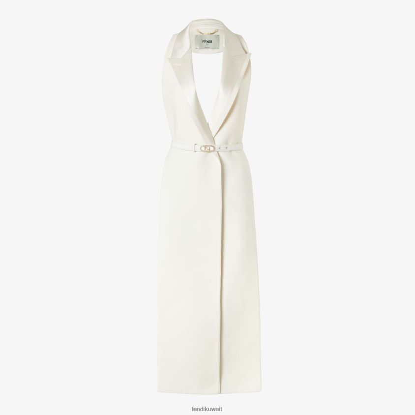 معطف متعدد الطبقات مصمم. يتكون هذا النمط من معطف طويل بدون طية صدر السترة وسترة بدون ظهر قابلة للإزالة مع طية صدر السترة. يمكن ارتداؤها معًا أو بشكل منفصل. حزام مطابق بإبزيم معدني من فندي أولوك. مصنوعة من الصوف الأبيض. الجيليه له ياقة وطية صدر من الحرير الأبيض.