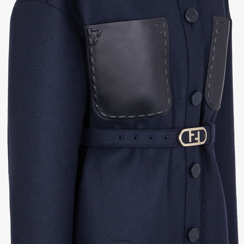 معطف بقصة مستقيمة وياقة قميص وأكمام منخفضة القطع. جيوب ماكسي التصحيح على الصدر. إغلاق بصدر واحد مع أزرار وحزام مطابق عند الخصر بإبزيم معدني من فندي أولوك. مصنوعة من الصوف الأزرق الداكن. تم تشطيب الجيوب بزخرفة خياطة سيليريا المرتفعة. أزرار ff karligraphy مخصصة.