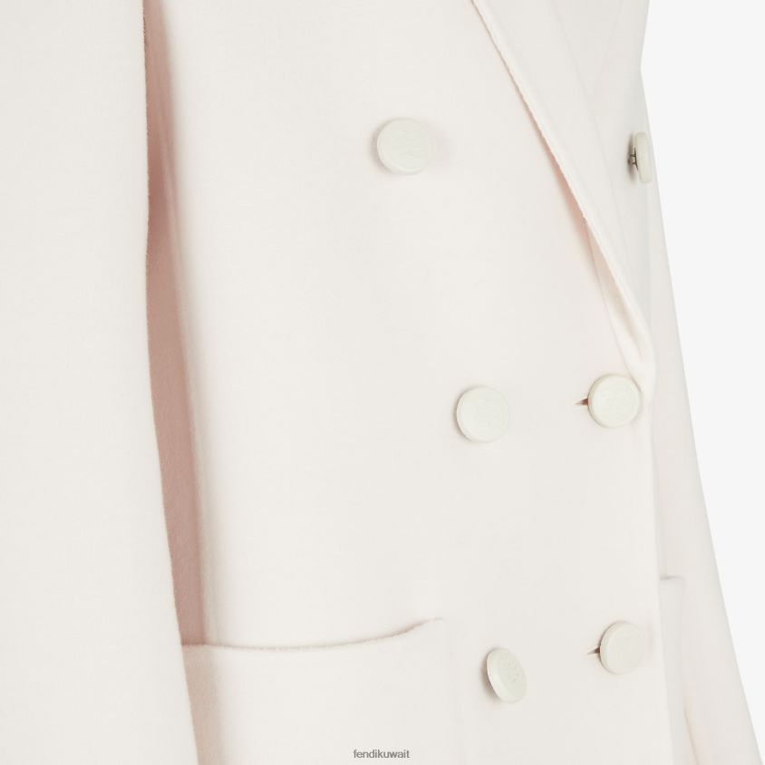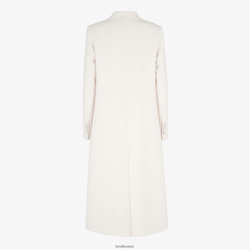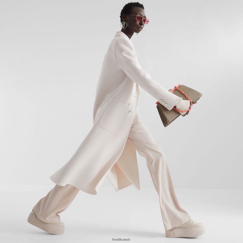 معطف طويل مزدوج الصدر، مع طية صدر السترة وجيوب رقعة. إغلاق الزر. مصنوع من نسيج مزدوج من الصوف الأبيض. بطانة مع شعار ff بلون مطابق بالكامل.