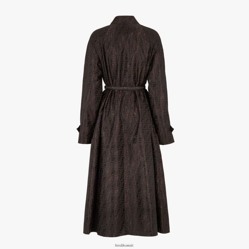 معطف طويل ذو صدر واحد. ياقة القميص وأكمام ريجلان طويلة مع أشرطة على الأصفاد. جيوب بحاشية على الجانبين. إغلاق مخفي. مصنوع من قماش الجاكار باللون البني. حزام مطابق بإبزيم معدني على شكل حرف ff.