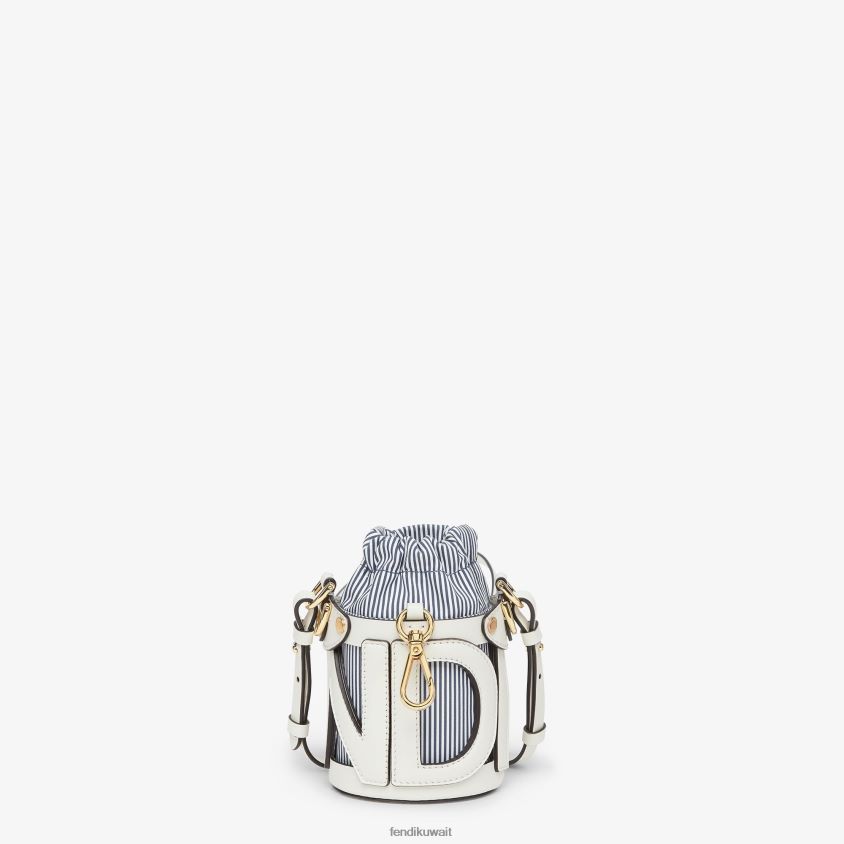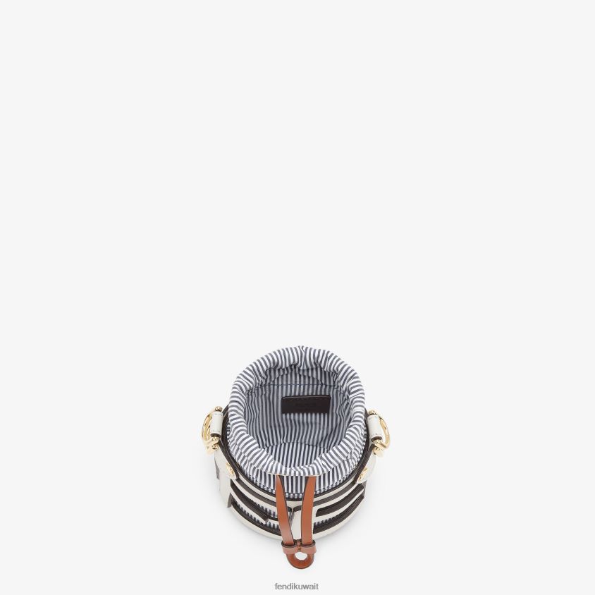 حقيبة دلو نانو مصنوعة من الجلد الأبيض مع حجرة داخلية مبطنة بقماش مخطط باللونين الأبيض والأزرق. يتم تحديد الشكل الأسطواني للحقيبة من خلال حروف فندي المصنوعة من الجلد الأبيض.