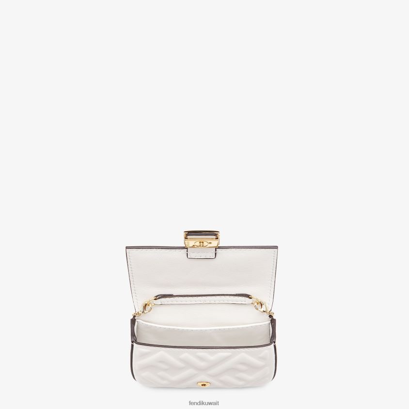 حقيبة باغيت مميزة بإصدار صغير، مع غطاء وشعار ff للإغلاق بمشبك مغناطيسي. يسمح المشبك بربطه بأكياس أو أحزمة أكبر. ويمكن أيضًا ارتداؤها بشكل متقاطع بفضل حزام الكتف الرفيع. بطانة مع جيب مسطح. مصنوع من جلد النابا الأبيض. مزين بزخرفة ff منقوشة. أدوات معدنية مطلية بالذهب.