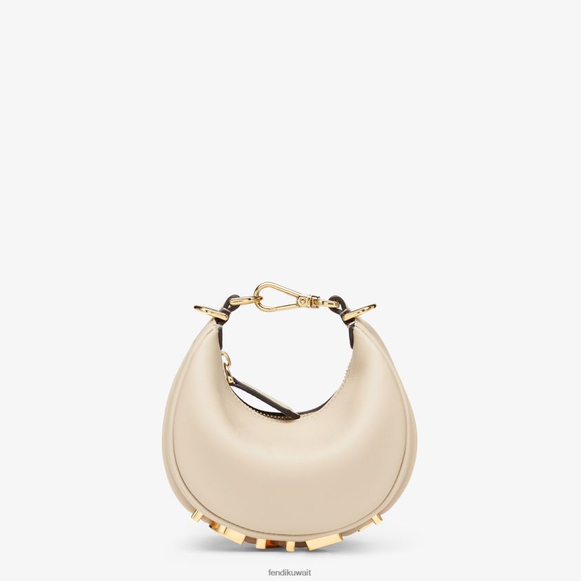 حقيبة هوبو نانو فنديجرافي مع سحاب للإغلاق، ومزينة بحروف فندي معدنية ذهبية عتيقة. يسمح الحزام القابل للتعديل مع المشبك بربطها بحقائب أكبر أو ارتدائها على المعصم. يأتي مع خطافات لحزام الكتف. مصنوع من الجلد البيج. أدوات معدنية مطلية بالذهب.
