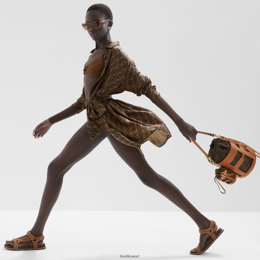 حقيبة دلو نانو مصنوعة من الجلد البني مع حجرة داخلية مبطنة بقماش الجاكار بنقش ff باللون البني والتبغ. يتم تحديد الشكل الأسطواني للحقيبة من خلال حروف فندي المصنوعة من الجلد البني.