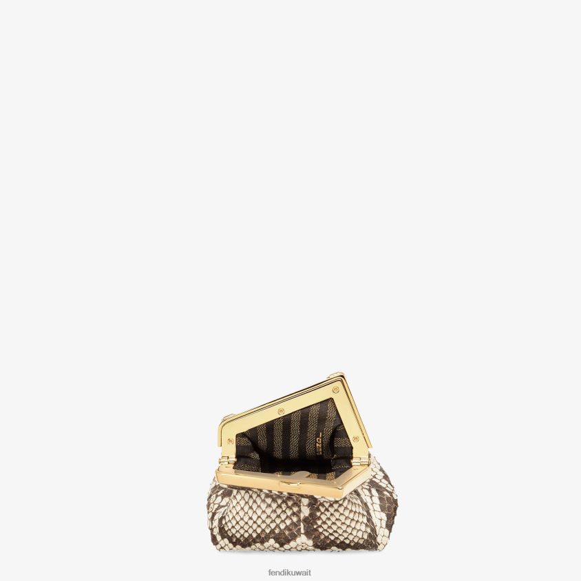 حقيبة Fendi First nano، مزودة بمشبك ومشبك قطري على شكل حرف FF في الخلف يسمح بربطها بحقائب أو أحزمة أكبر مثل التعويذة. كما يمكن ارتداؤها بشكل متقاطع بفضل حزام الكتف القابل للتعديل. إنه الشكل المثالي لحمل سماعات الأذن اللاسلكية airpods أو airpods pro. مصنوعة من قماش إيلاف بطباعة الثعبان البني. أدوات معدنية مطلية بالذهب.