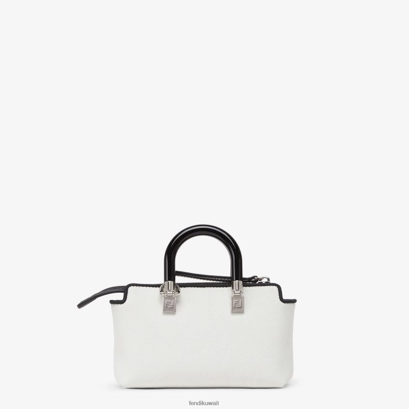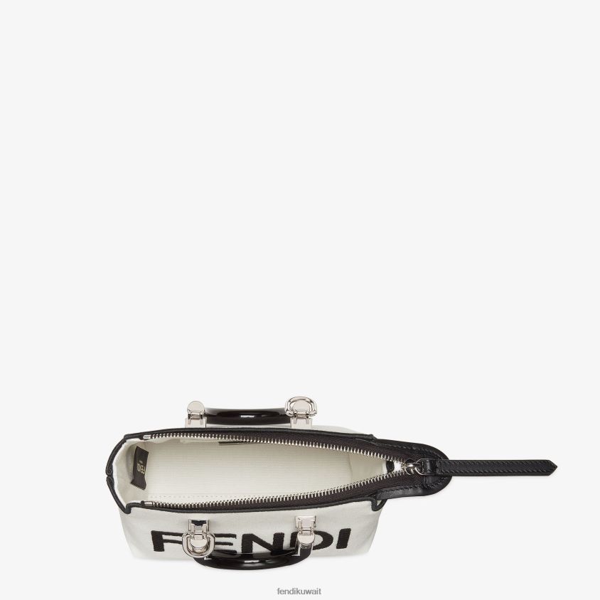 حقيبة صغيرة مميزة من باي ذا واي بوسطن مصنوعة من القماش الأبيض مع حروف فندي روما السوداء المختومة ومقابض زجاجية صلبة سوداء. إغلاق بسحاب.