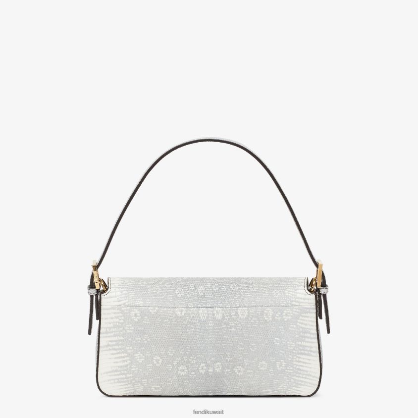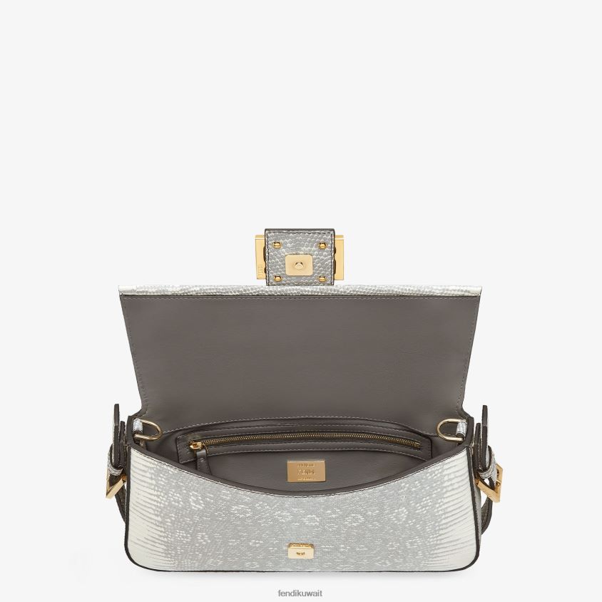 حقيبة باغيت متوسطة الحجم من طراز 1997 مصنوعة من جلد السحلية بلون حجري مزين بمشبك على شكل حرف ff.
