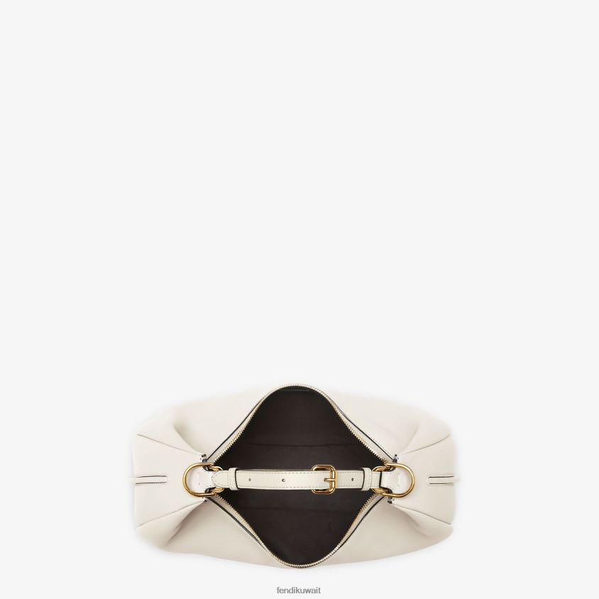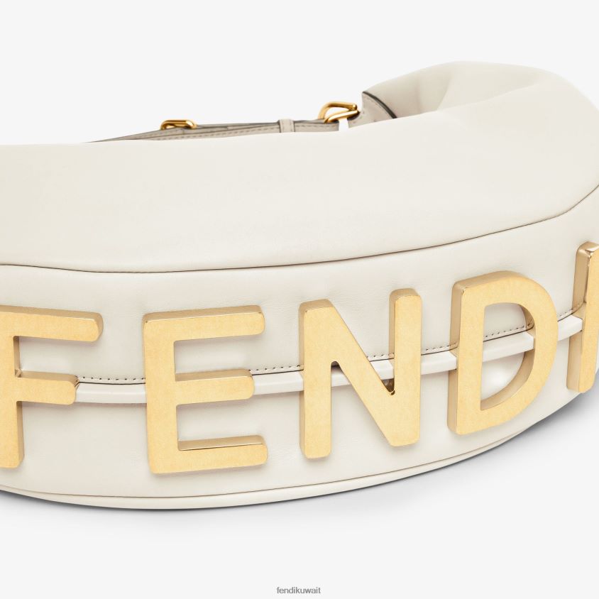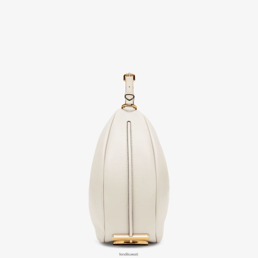 حقيبة هوبو متوسطة الحجم مصنوعة من الجلد باللون الأبيض الثلجي، ومزينة بحروف فندي معدنية ذهبية عتيقة، يمكن رؤيتها عند ارتداء الحقيبة تحت الذراع.