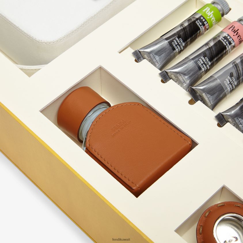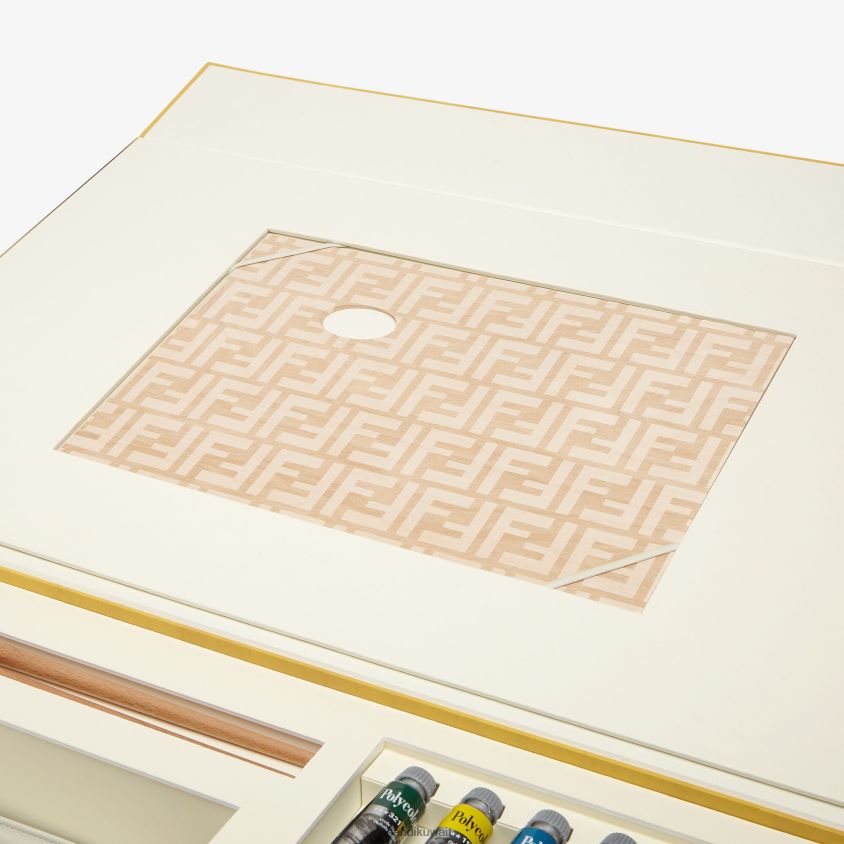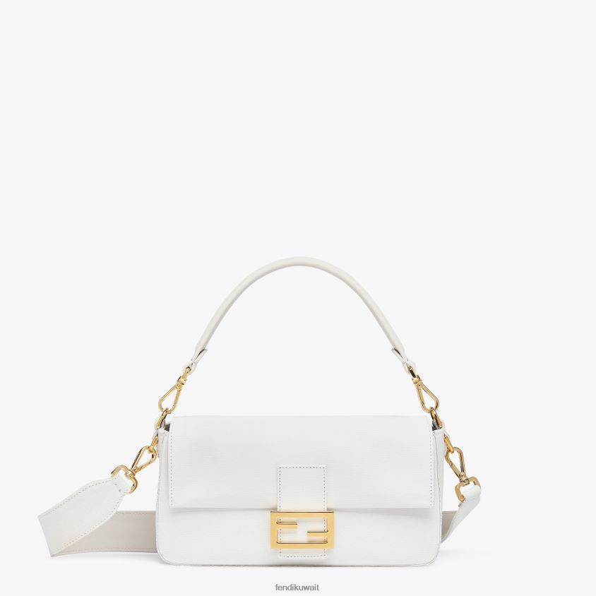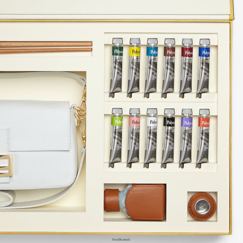 حقيبة باغيت متوسطة الحجم مصنوعة من القماش الأبيض ومزينة بمشبك ff. تتضمن مجموعة طلاء لإضفاء طابع شخصي على الحقيبة.