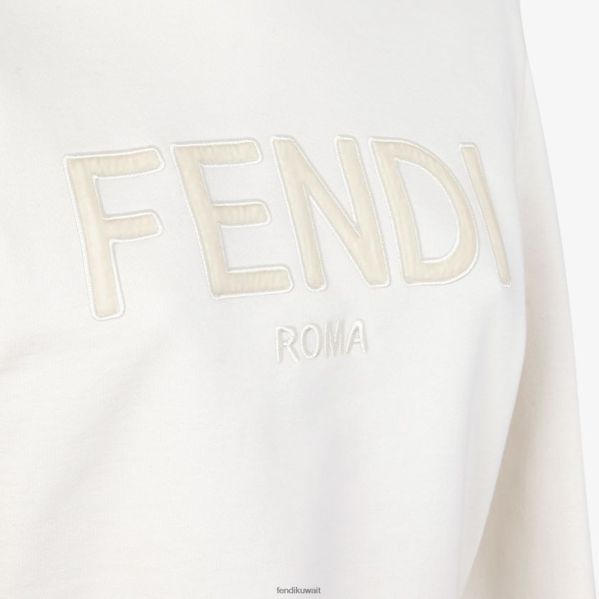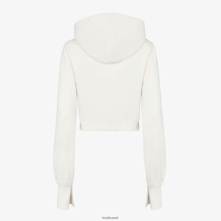 سترة قصيرة مع غطاء محرك السيارة الرباط. الأصفاد مضلع وتنحنح. مصنوع من قطن الجيرسيه الأبيض. حروف فندي مطرزة على الجهة الأمامية ومزينة بلون مخملي مطابق.