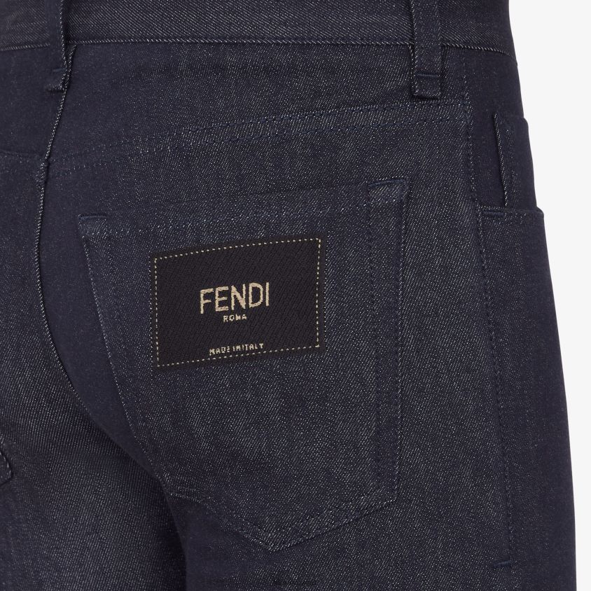 بنطال نحيف بخمسة جيوب. مزين بالمسامير والأزرار ذات العلامات التجارية. مصنوع من قماش الدنيم القطني المطاطي باللون الأزرق الداكن. مزين بشعار فندي جاكار مطرز على الجيب الخلفي