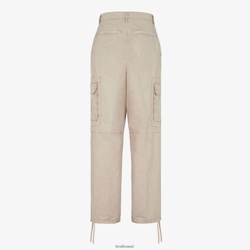بنطال كارغو بقصة مستقيمة. جيوب جانبية، وجيوب رقعة على الساقين، وجيوب مبطنة في الخلف. تفاصيل الرباط على الكاحل. إغلاق بسحاب مخفي. مصنوع من قطن الجبردين المطاطي باللون البيج. تفاصيل مدمرة بسبب التأثير البالي. مزين بشعار فندي جاكار مطرز على الجيب الأيسر.