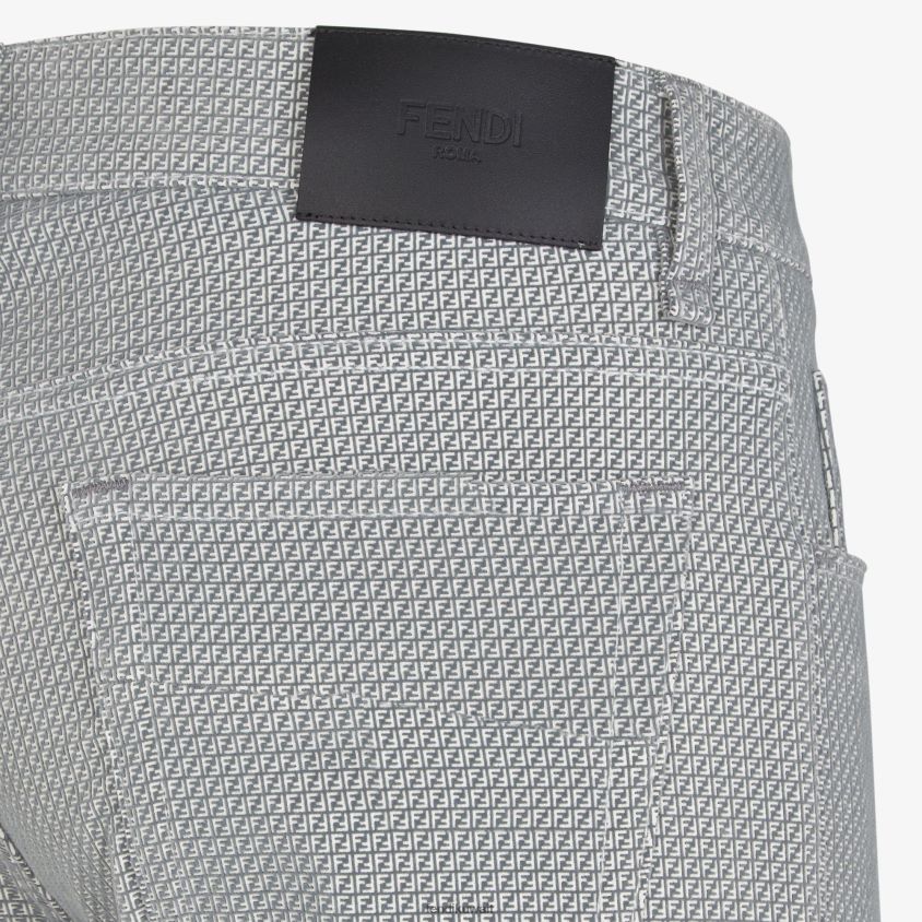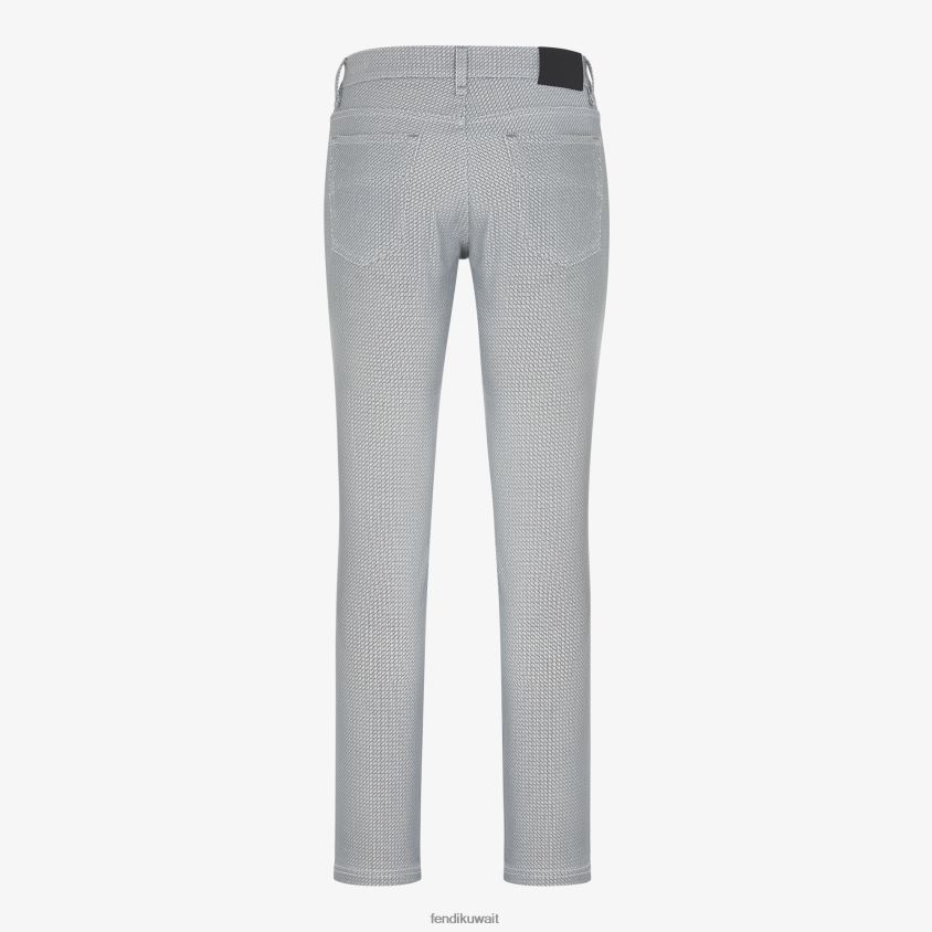 بنطال مدبب بخمسة جيوب وقصة ضيقة. مزين بالمسامير والأزرار ذات العلامات التجارية. مصنوع من قطن الدنيم باللون الرمادي مع شعار ff متدفق بالكامل بنفس الألوان.