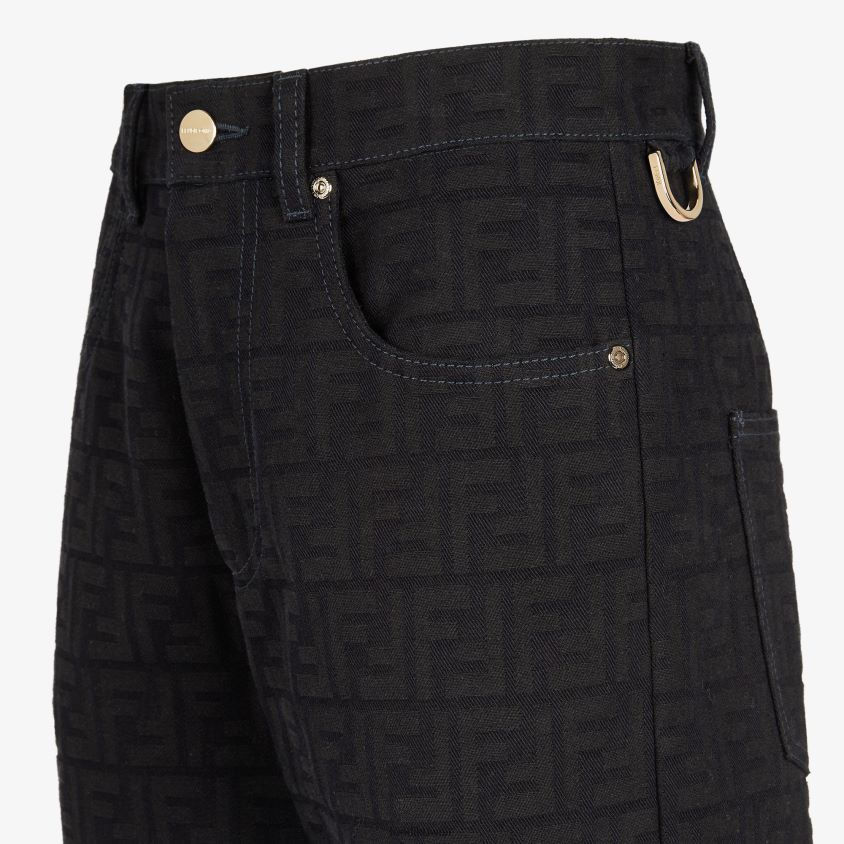 بنطال بقصة مستقيمة و5 جيوب. سحاب مخفي وزر إغلاق بالشعار. مصنوع من قطن الدنيم باللون الأزرق الداكن مع زخرفة جاكار ff متطابقة على كامل التصميم. مزين بخياطة متباينة وحلقة معدنية عند الخصر. ملصق جلدي يحمل شعار فندي خلف الخصر.