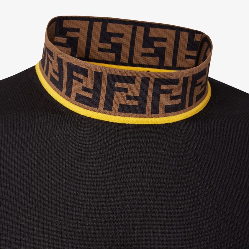 سترة الياقة المدورة بأكمام طويلة. تناسب منتظم. مصنوعة من الصوف الأسود. ياقة مزينة بزخارف ff وحدود باللون الأصفر.