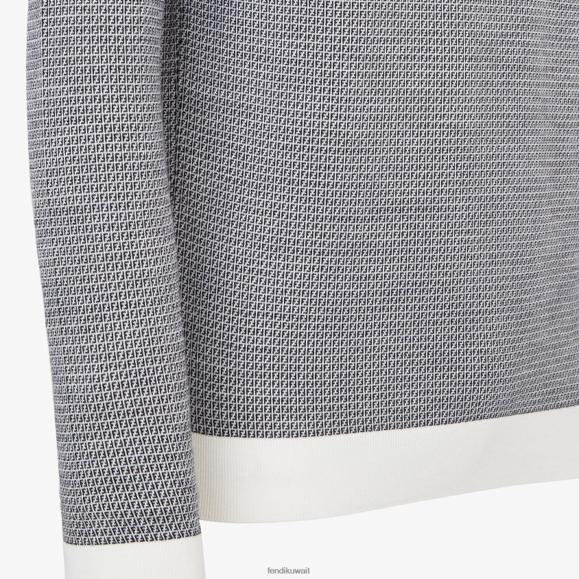 بلوفر بمقاس عادي بياقة دائرية وأكمام طويلة. الحدود مزينة بالتضليع. مصنوع من خيوط الفيسكوز المحبوكة بنمط ff باللون الأسود. مزين بياقة وأساور وحافة بيضاء سادة.