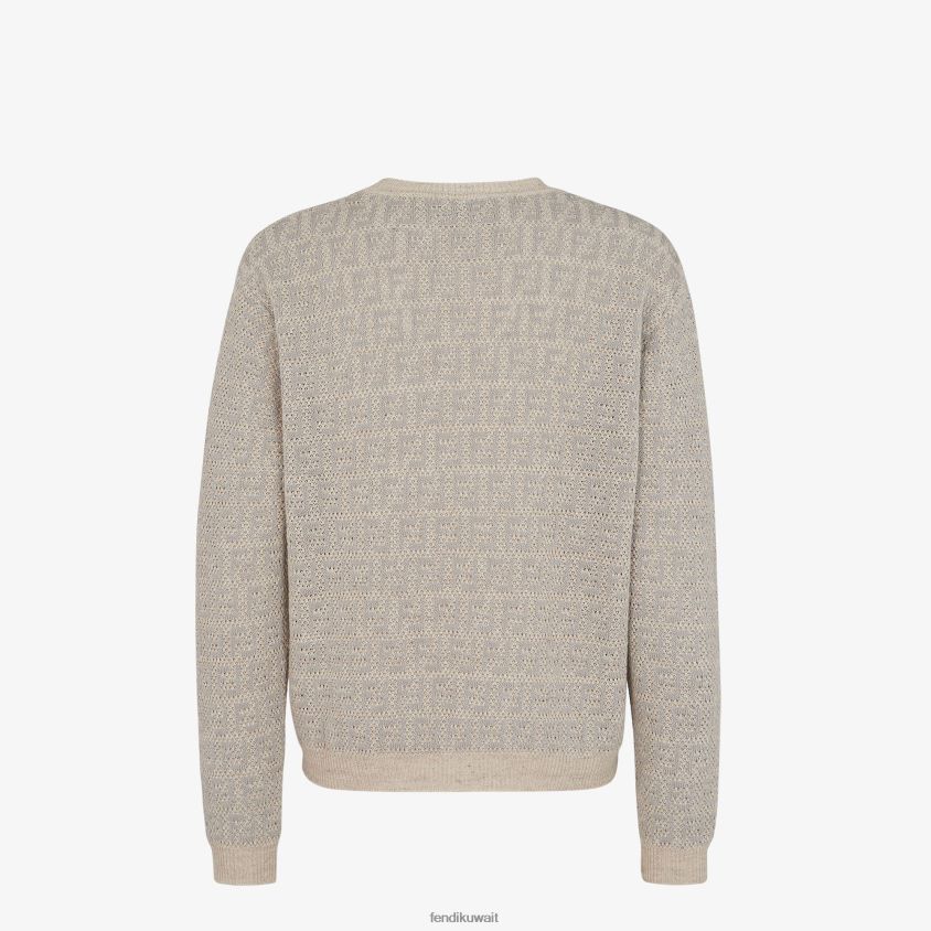 سترة ذات قصة عادية بياقة دائرية وأكمام طويلة. حواف مضلعة. مصنوعة من خيوط الكتان والقطن والحرير. يصور الحياكة الخاصة والأنسجة المتباينة المتنوعة شعارًا باللونين الرمادي والبيج.