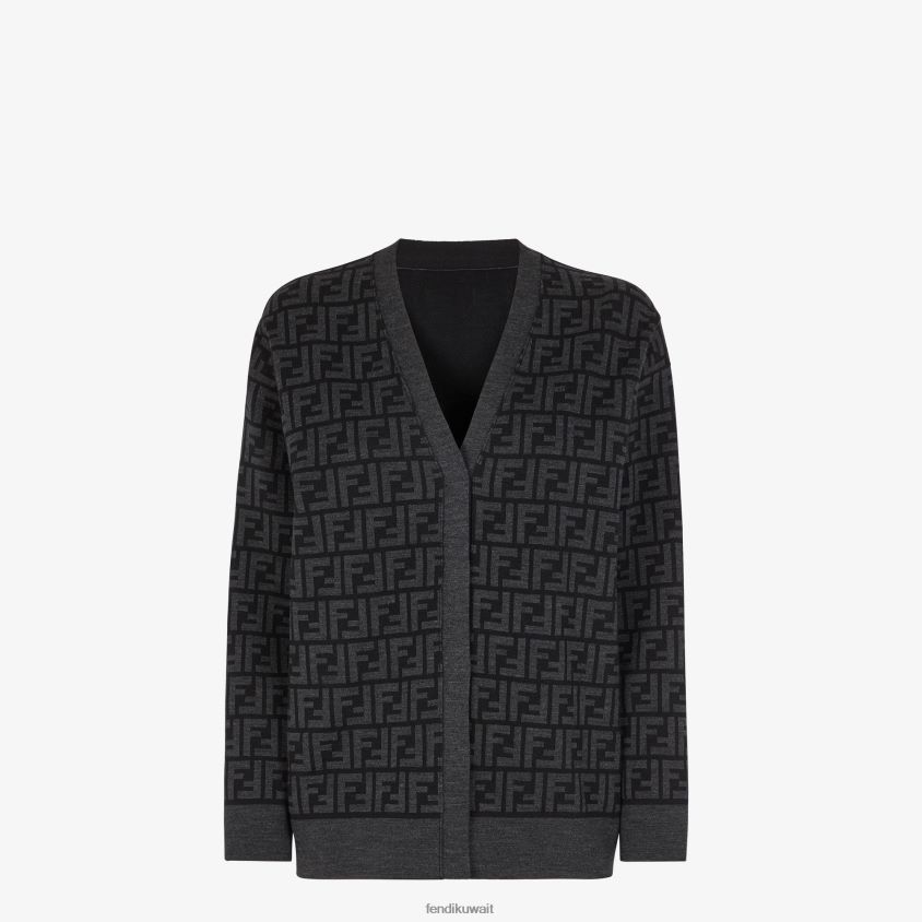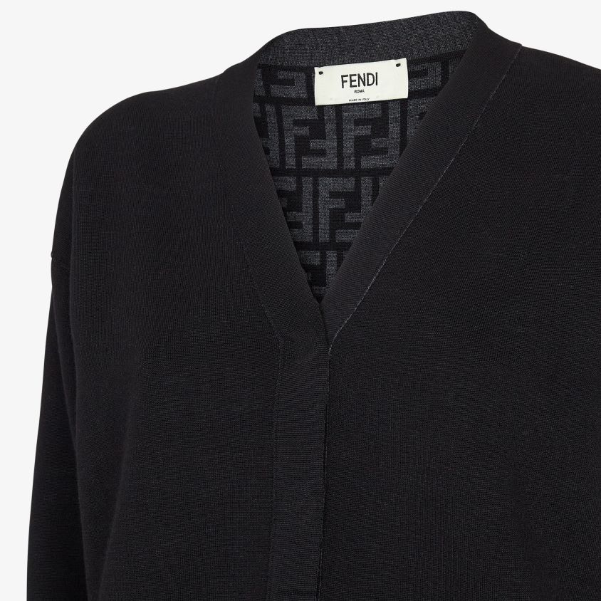 سترة ذات أكمام طويلة ورقبة على شكل حرف V قابلة للعكس. إغلاق المفاجئة. مصنوع من الصوف الأسود في نسيج متماسك على الوجهين. بطانة مخصصة بزخارف جاكار ff باللونين الرمادي والأسود.