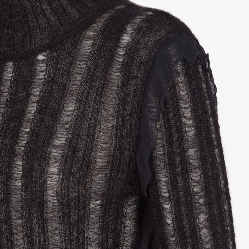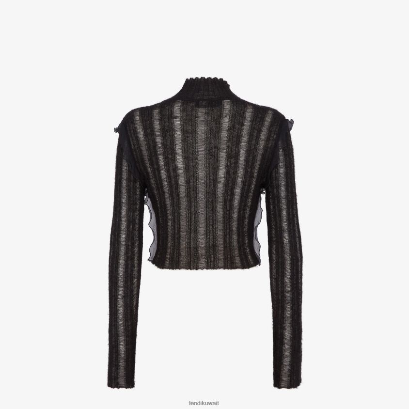 سترة قصيرة ضيقة بياقة عالية وأكمام طويلة. مصنوع من الموهير الأسود وخيوط النايلون، محبوك بضلع مسطح للحصول على تأثير شبه شفاف. تم تشطيبه بكشكشة متطابقة الألوان على فتحة الذراع وأسفل الجوانب.
