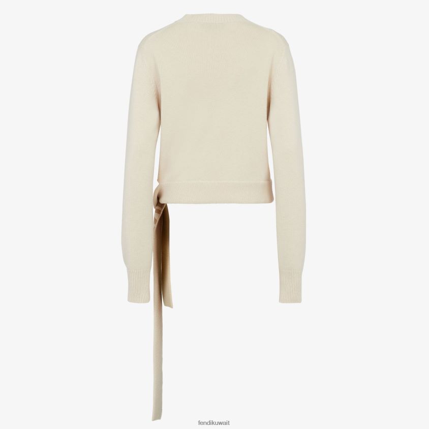 سترة بأكمام طويلة. مصنوعة من الصوف البيج الفاتح وخيوط الكشمير. تم تزيين الجانب السفلي من الحدود بشعار مرآة فندي المطبوع بدرجة متباينة دقيقة، ويمكن رؤيته في الشكل المعقود على الجانب الأيسر. تم تشطيبه بتفاصيل مقصوصة على خط الرقبة.