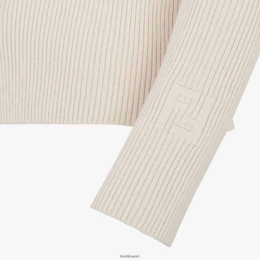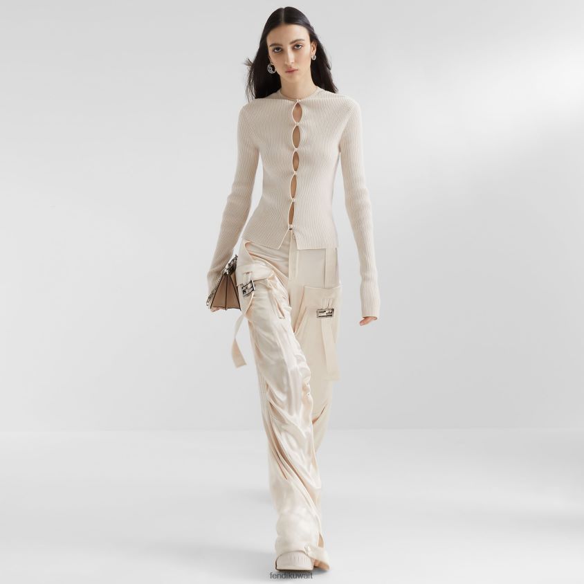 سترة صوفية بقصة ضيقة وياقة دائرية وأكمام طويلة جدًا. مصنوع من قطن جيرسي باللون البيج الفاتح في نسيج مضلع. يخلق الإغلاق الأمامي المزود بأزرار كبس شكلاً مقصوصًا يتكرر أيضًا على الأكتاف والمرفقين. مزين بتفاصيل ff على الكم الأيسر.