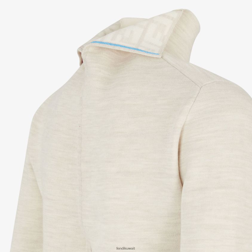 بلوفر بوجهين وأكمام طويلة. تم الانتهاء من الياقة العالية بشق في منتصف الظهر. مصنوع من خيوط الصوف مع جانب واحد بلون بيج وزخرفة ff بالكامل بنفس اللون على الجانب الآخر. تم تشطيبه بأنابيب وربطة عنق داخلية عند الياقة باللون الأزرق الفاتح.