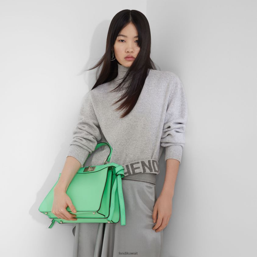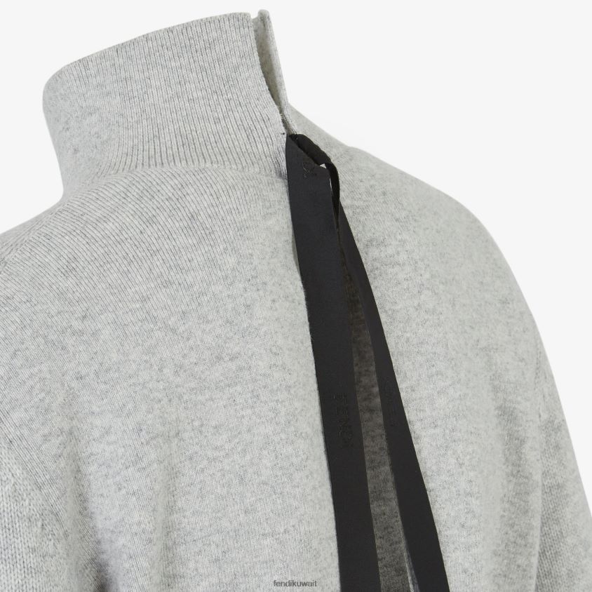 سترة كبيرة الحجم قليلاً بياقة عالية وأكمام طويلة. حواف مضلعة. مصنوع من خيوط الكشمير والصوف بمزيج رمادي. تم تشطيب الحدود على الجانب السفلي بزخارف مرآة فندي المطبوعة بلون متباين رقيق.
