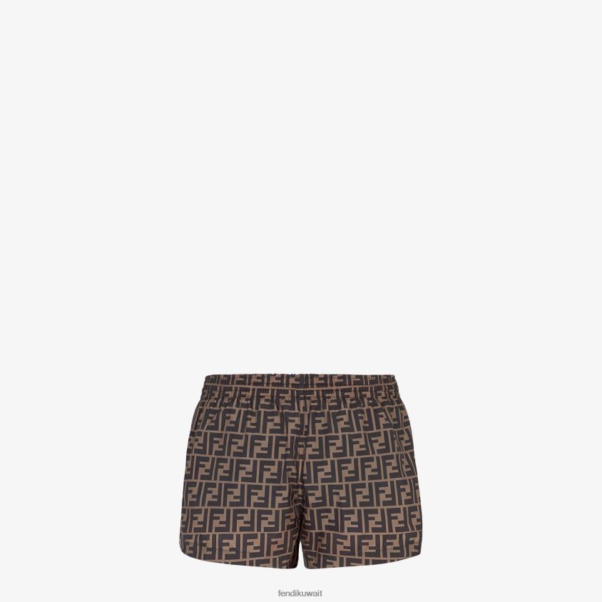 شورت سباحة بحزام خصر مطاطي ورباط. مصنوع من القماش بزخارف باللون البني.