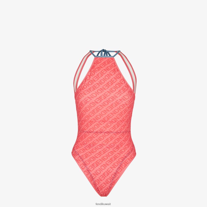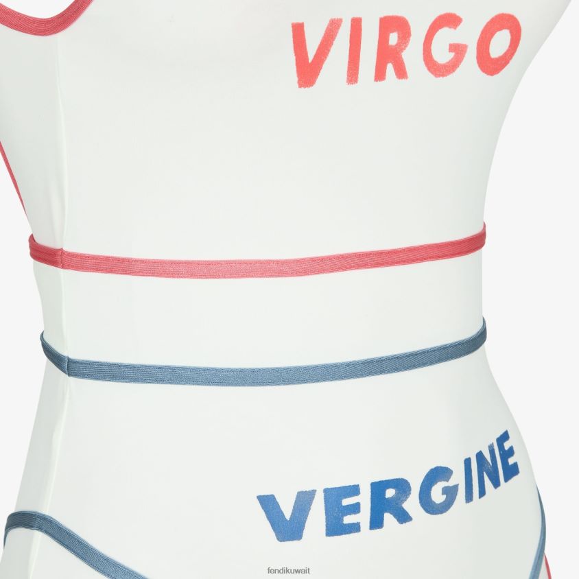 ثوب سباحة من قطعة واحدة بياقة رسن وظهر عاري وإبزيم كبس على الجزء الخلفي من الياقة. مصنوع من الليكرا الأبيض مع طباعة حروف تنجيم فندي متباينة على الجهة الأمامية. مزين بأنابيب مزدوجة على الحواف وخط الخصر باللون الوردي والأزرق الفاتح. حقيبة متطابقة مع رباط وشعار فندي روما.