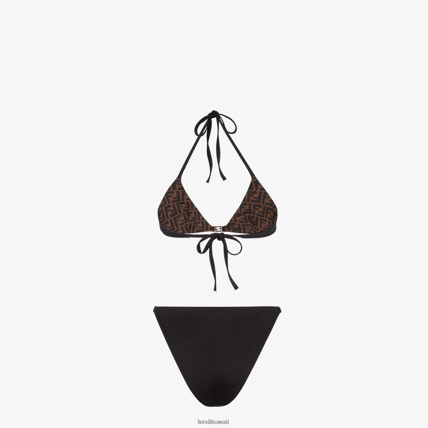ملابس سباحة من قطعتين مع حمالة صدر مثلثة وسروال تانجا. مصنوع من الليكرا باللون الأسود. مزين بتفاصيل معدنية ذهبية اللون على الجهة الأمامية. بطانة بزخارف ff على كامل التصميم.