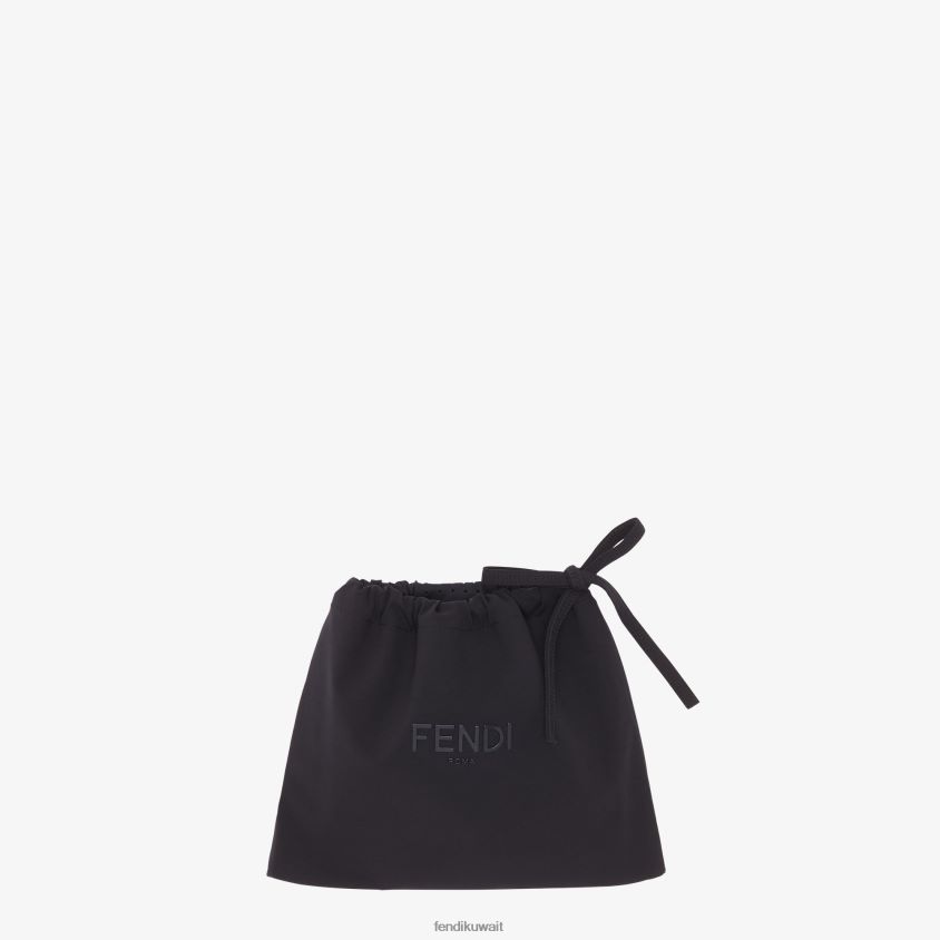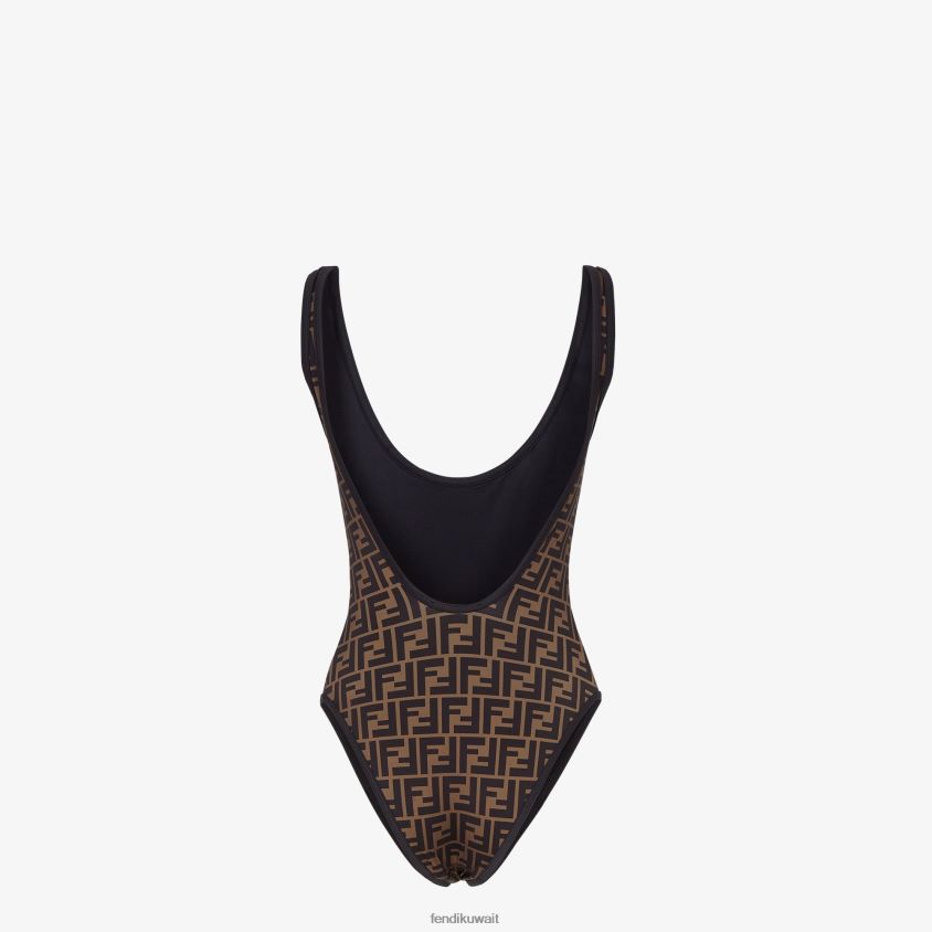 ملابس السباحة مصنوعة من الليكرا باللون البني مع شعار ff على كامل التصميم. مزين بملامح متباينة باللون الأسود. حقيبة برباط متطابقة مع شعار فندي على الجهة الأمامية.
