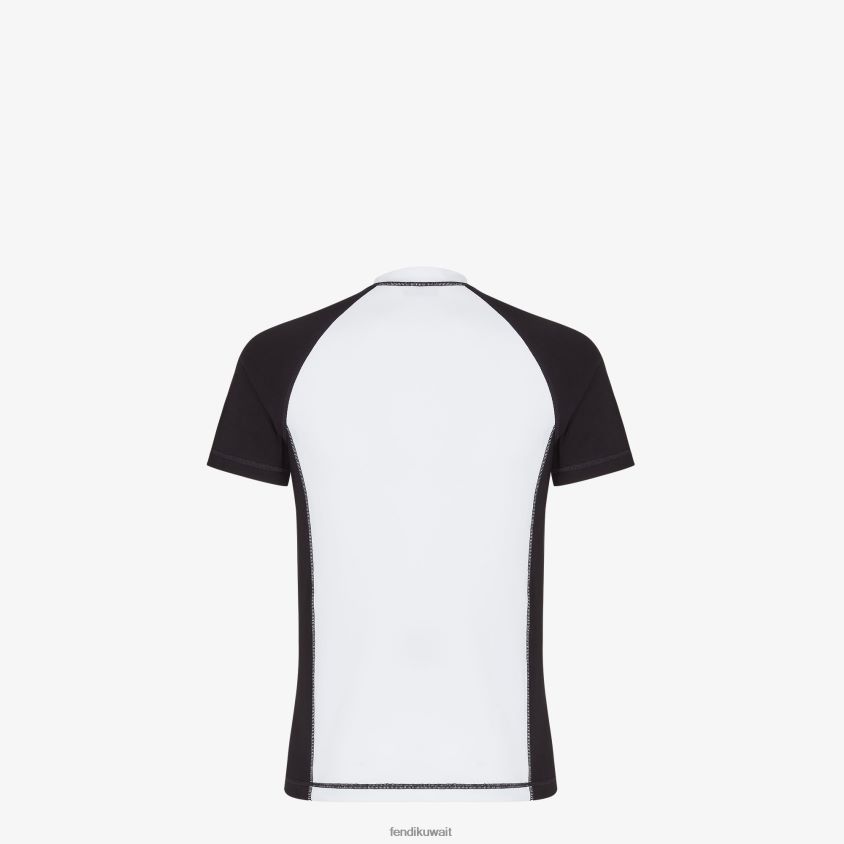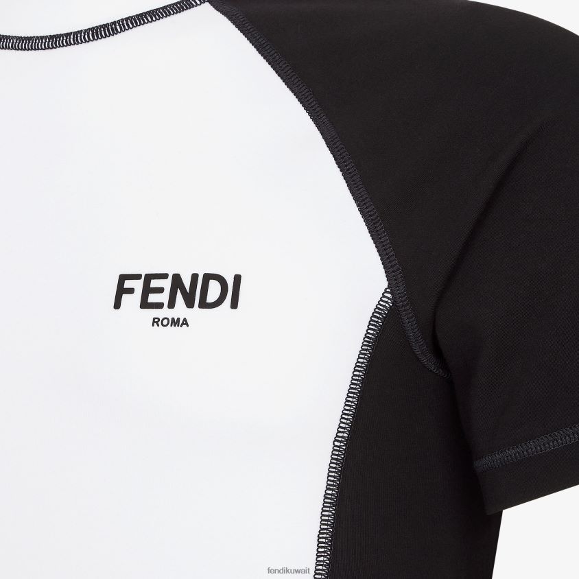 تي شيرت ضيق بياقة عالية وأكمام ريجلان قصيرة. مصنوع من القطن الأبيض المطاطي مع حشوات سوداء وخياطة سوداء. شعار فندي روما على الصدر.