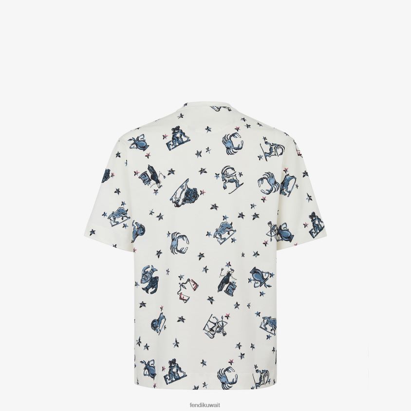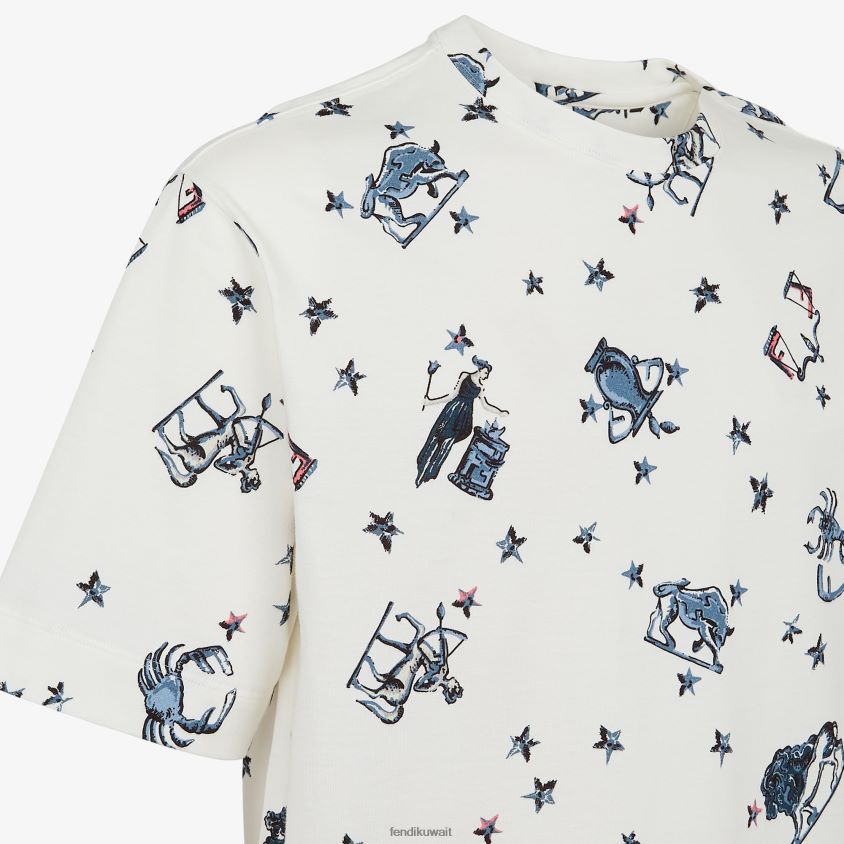 تي شيرت كبير الحجم بأكمام قصيرة ورقبة دائرية. مصنوع من قطن الجيرسيه الأبيض. مزين بزخارف تنجيم فندي مطبوعة باللون الأزرق.