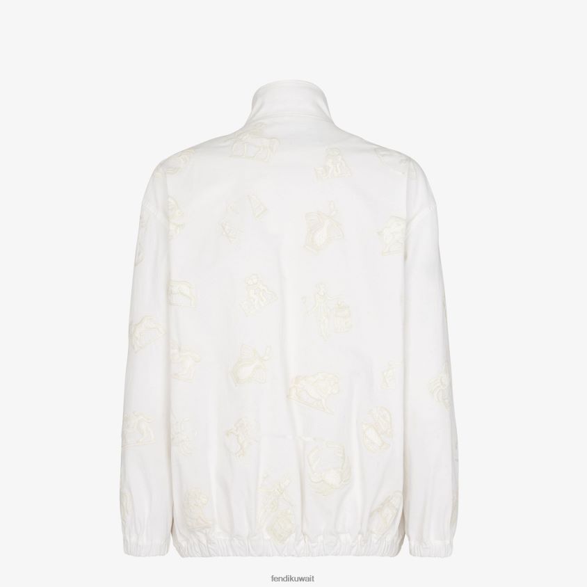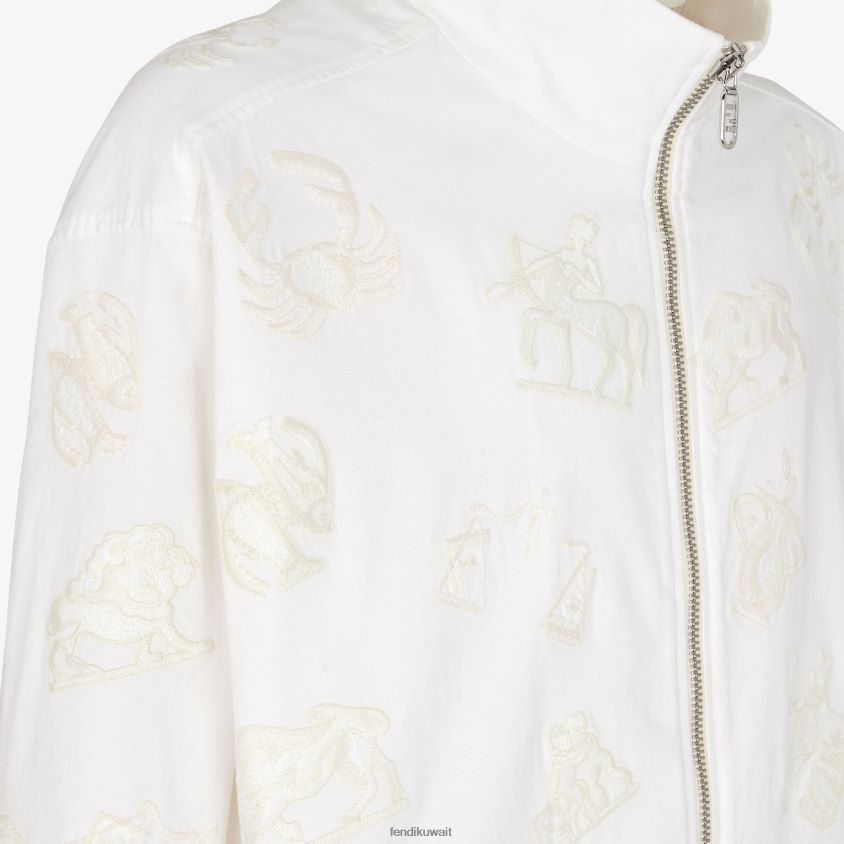 سترة كبيرة الحجم بأكمام طويلة وياقة عالية. الأصفاد المرنة وتنحنح. إبزيم بسحاب مرئي. مصنوعة من نسيج القطن الأبيض القابل للتمدد. مزخرف بالكامل بزخارف علم التنجيم من فندي ومطرزة بنفس اللون.