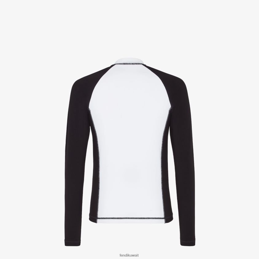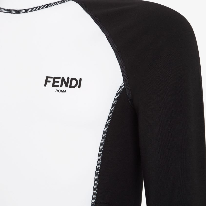 سترة ضيقة مع ياقة عالية وأكمام ريجلان طويلة. مصنوع من القطن الأبيض المطاطي مع حشوات سوداء وخياطة سوداء. شعار فندي روما على الصدر.